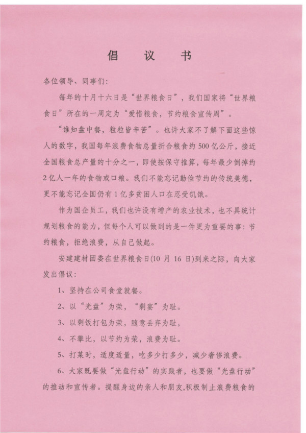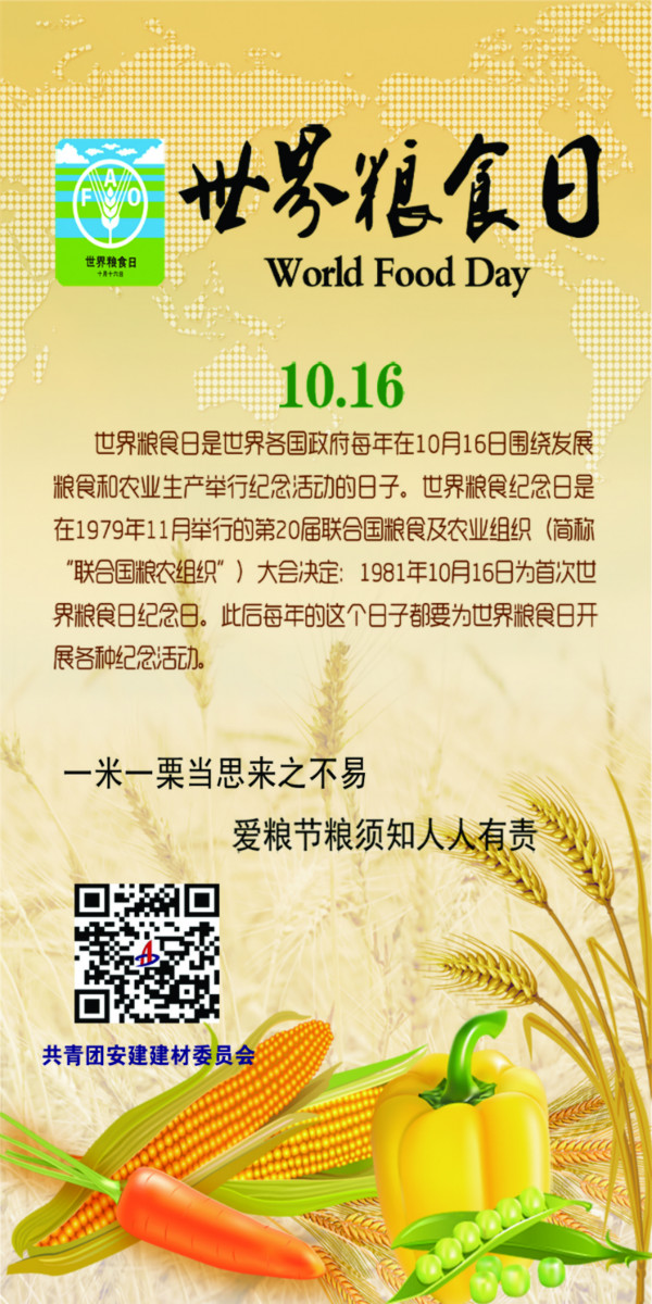 每年的10月16日是世界糧食日,每年世界糧食日所在周為全國愛(ài)惜糧食節約糧食宣傳周。安建建材團委通過(guò)張貼節糧倡議書(shū)、發(fā)放愛(ài)糧節糧宣傳卡片、征集愛(ài)糧節糧宣言等方式廣泛引導、帶動(dòng)全體員工積極參與,大力宣傳愛(ài)糧節糧科學(xué)知識,號召大家養成居安思危、處豐思歉、惜糧如金、節糧成習的良好風(fēng)尚,從我做起、從身邊做起,減少糧食的損失與浪費。
