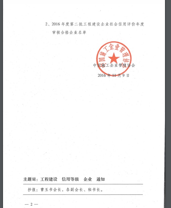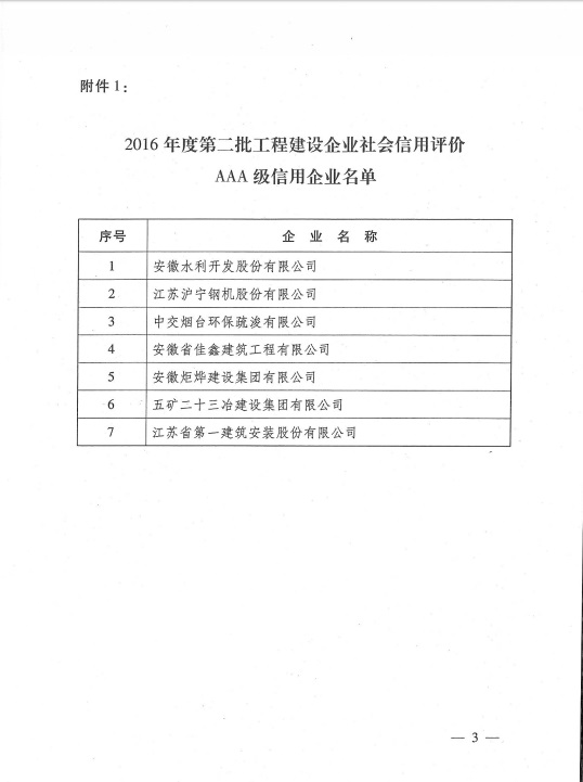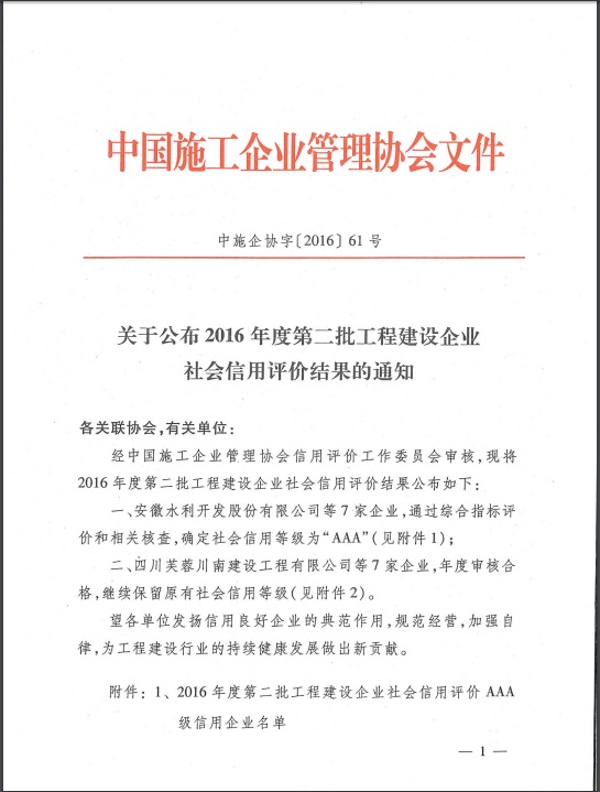 經(jīng)中國施工企業(yè)管理協(xié)會(huì )信用評價(jià)工作委員會(huì )審核,安徽水利開(kāi)發(fā)股份有限公司被授予2016年度第二批工程建設企業(yè)社會(huì )信用評價(jià)AAA級信用企業(yè)單位。