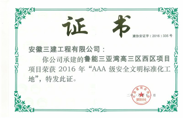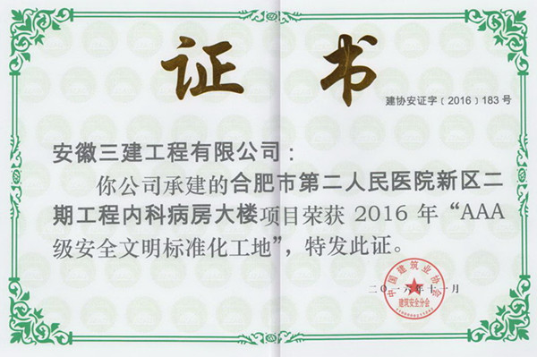 2016年11月29日,中國建筑業(yè)協(xié)會(huì )建筑安全分會(huì )2016年年會(huì )暨理事會(huì )在合肥召開(kāi),會(huì )上傳來(lái)好消息,我公司合肥市第二人民醫院新區二期工程內科病房大樓項目和魯能三亞灣高三區西區項目雙雙獲得“AAA級安全文明標準化工地”。公司副總經(jīng)理何洪春作為唯一的安徽企業(yè)代表在會(huì )上做了交流發(fā)言,向來(lái)自全國的500多家建筑企業(yè),介紹了我公司在建筑安全標準化示范工地創(chuàng )建上的經(jīng)驗和特色做法。