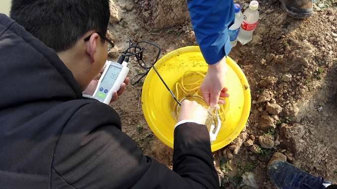 課題組一行在聽(tīng)取項目概況和有關(guān)介紹后,實(shí)地察看了中湖地質(zhì)環(huán)境治理項目(一期、二期)總體控制性詳細規劃區域。根據察看結果和背景資料,分析了該科研項目當前緊迫的任務(wù)、現場(chǎng)地形地貌和周邊環(huán)境(特別是水系和塌陷區采空層情況),具體采樣工作包括采集土樣、水樣、沉降觀(guān)測點(diǎn)的選擇,并實(shí)時(shí)檢測了水樣的pH值等基礎指標等。
