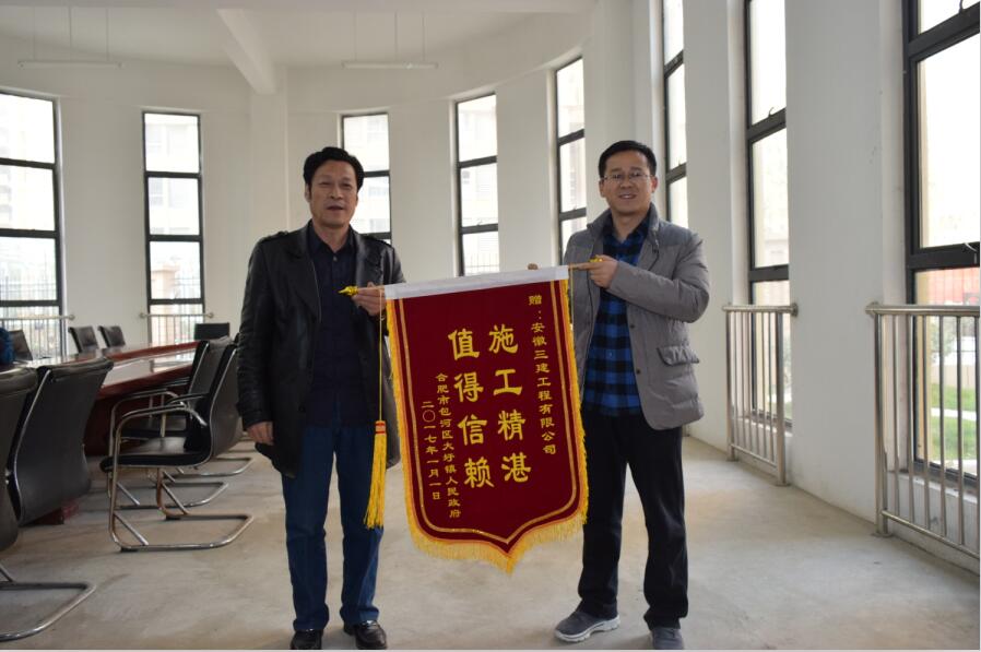 1月22日,合肥市包河區大圩鎮人民政府常務(wù)副鎮長(cháng)、黨委委員丁傳富同志代表鎮政府在大圩金葡萄家園三標段項目現場(chǎng),授予安徽三建工程有限公司“施工精湛,值得信賴(lài)”錦旗。感謝項目全體人員為大圩的建設所作出的突出貢獻,代表大圩幾千名回遷業(yè)主感謝安徽三建(八公司)。