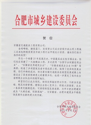 近日,合肥市建委向安徽交航發(fā)來(lái)賀信,熱烈祝賀安徽交航取得市政公用工程施工總承包特級資質(zhì)及市政行業(yè)甲級設計資質(zhì)。
