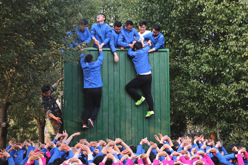 令人印象最深的是本次培訓的最后一個(gè)項目“畢業(yè)墻”活動(dòng),全體130名“受困”員工要在不借助外力的情況下,通過(guò)團隊力量,在20分鐘內徒手越過(guò)4米多高的垂直板墻“脫險”。一開(kāi)始,許多人都感到信心不足。在張鍵董事長(cháng)的帶領(lǐng)下,大家聚在一起研究方案,最后決定采用搭建三層人梯、定人定責、下推上拉的方式攀越板墻。“脫困”過(guò)程中,安建建材的小伙子們勇于擔當,沖鋒陷陣,以無(wú)畏奉獻的精神積極投入到同事的“營(yíng)救”中,女同胞們在一旁舉起雙手,架起“防護網(wǎng)”,幫忙吶喊助威。困境之中,有勇當開(kāi)路先鋒的、有甘當人墻的、有負責墊后的……大家團結協(xié)作、爭先恐后、共克難關(guān),董事長(cháng)張鍵更是以身作則,默默當起人墻,用堅實(shí)的肩膀托舉“遇困”員工翻越高墻,整個(gè)場(chǎng)面感人至深。通過(guò)高效的團隊協(xié)作、堅定必勝的信心,在短短的17分鐘內,所有“遇困”員工便被安全“營(yíng)救”到高墻之外,沒(méi)有一名被落下?;顒?dòng)最后,所有人聚到了一起,看著(zhù)小伙子們一個(gè)個(gè)漲紅的臉頰、被踩的印記鮮紅的肩膀,回憶著(zhù)兩天來(lái)的點(diǎn)點(diǎn)滴滴……大家感受到了安建建材公司這個(gè)大家庭的溫暖,不禁熱淚盈眶,相擁到了一起、感動(dòng)到了一起、心擰到了起……