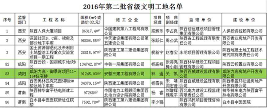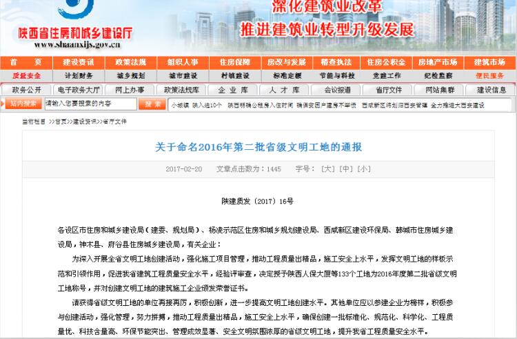 日前,陜西省住房和城鄉建設廳發(fā)布《關(guān)于命名2016年第二批省級文明工地的通報》,對全省133個(gè)建設工地進(jìn)行命名表彰。安徽三建西北公司承建的力高•御景灣11-16#樓及地下車(chē)庫項目榜上有名。