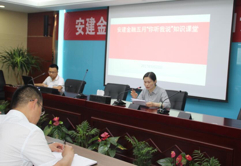 為進(jìn)一步提升公司員工綜合素質(zhì),打造學(xué)習型企業(yè),安建金融首堂“你聽(tīng)我說(shuō)”知識課堂于5月22日下午首次開(kāi)講。此次知識課堂由公司黨群工作部舉辦,安建金融全體員工參加學(xué)習。