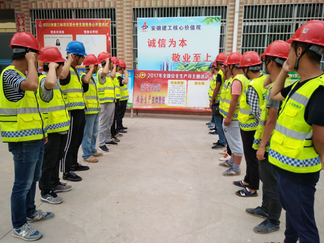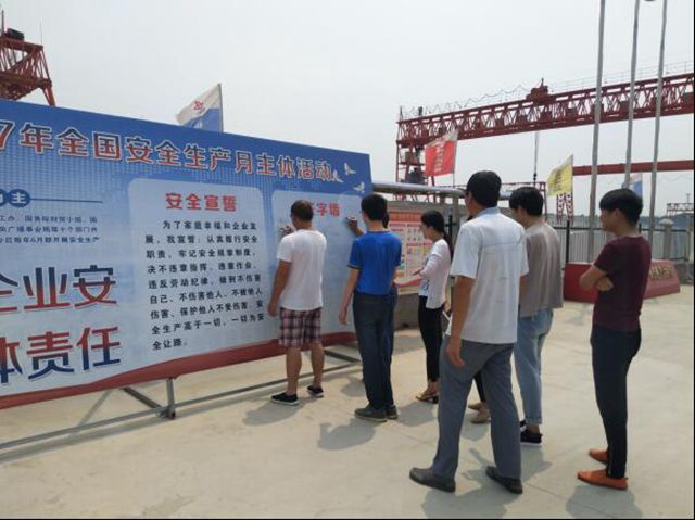 我是一名安徽建工人,我鄭重宣誓:時(shí)刻注意安全,遵守安全法規。履行安全職責,提高安全技能。杜絕三違現象,保證四不傷害。強化紅線(xiàn)意識,促進(jìn)安全發(fā)展。為了家人幸福、企業(yè)發(fā)展,誓做建工“安全人”。錚錚誓言響徹云霄,筆尖揮斥千金承諾。6月1日至2日,安徽路港公司機關(guān)及所屬各單位、項目部莊嚴舉行了2017年“安全生產(chǎn)月”宣誓簽名儀式,拉開(kāi)了今年以“全面落實(shí)企業(yè)安全生產(chǎn)主體責任”為主題的“安全生產(chǎn)月”系列活動(dòng)序幕。