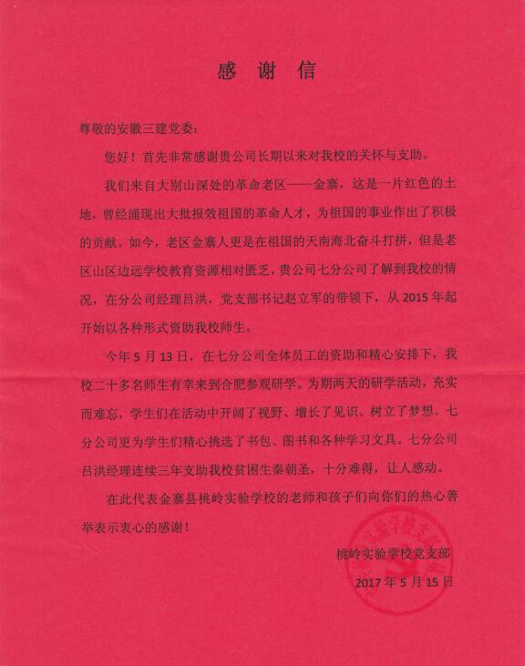 近日,金寨縣桃嶺實(shí)驗小學(xué)黨支部向安徽三建公司黨委發(fā)來(lái)感謝信,感謝安徽三建七分公司對先瑞希望小學(xué)的愛(ài)心捐助、無(wú)私貢獻、大愛(ài)無(wú)疆。七公司黨支部連續兩年在該校開(kāi)展幫扶活動(dòng),七公司經(jīng)理呂洪更是連續多年資助該校貧困生。