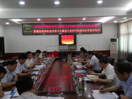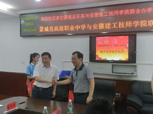 蒙城縣職高是安徽省首批國家重點(diǎn)職業(yè)高中、安徽省首批縣級職教中心、國家改革與發(fā)展示范校,在校生6000余人。與蒙城縣高級職業(yè)中學(xué)的成功合作,是安徽建工技師學(xué)院實(shí)施“高端引領(lǐng)、特色立?!卑l(fā)展戰略、創(chuàng )新高技能人才培養模式、密切校校合作、校企合作的重要舉措。