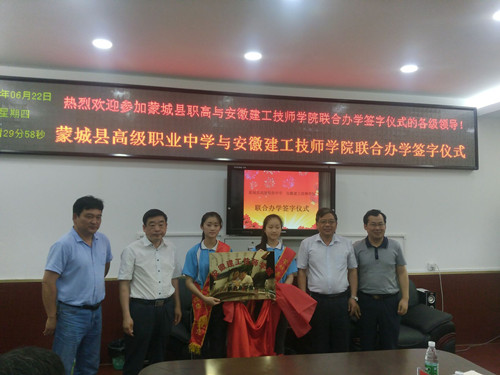 市、縣教育局領(lǐng)導分別在儀式上致賀詞,領(lǐng)導們對蒙城職高與安徽建工技師學(xué)院開(kāi)展職業(yè)教育聯(lián)合辦學(xué)表示熱烈祝賀。認為合作是創(chuàng )新職教培養模式的探索,有利于推動(dòng)職教辦學(xué)格局多元化、辦學(xué)層次升級化。強調職業(yè)教育要“走出去”,要走集團化辦學(xué)和聯(lián)合辦學(xué)的路子,要把握國家和省、市大力發(fā)展職教的契機,實(shí)現資源共享,優(yōu)勢互補。