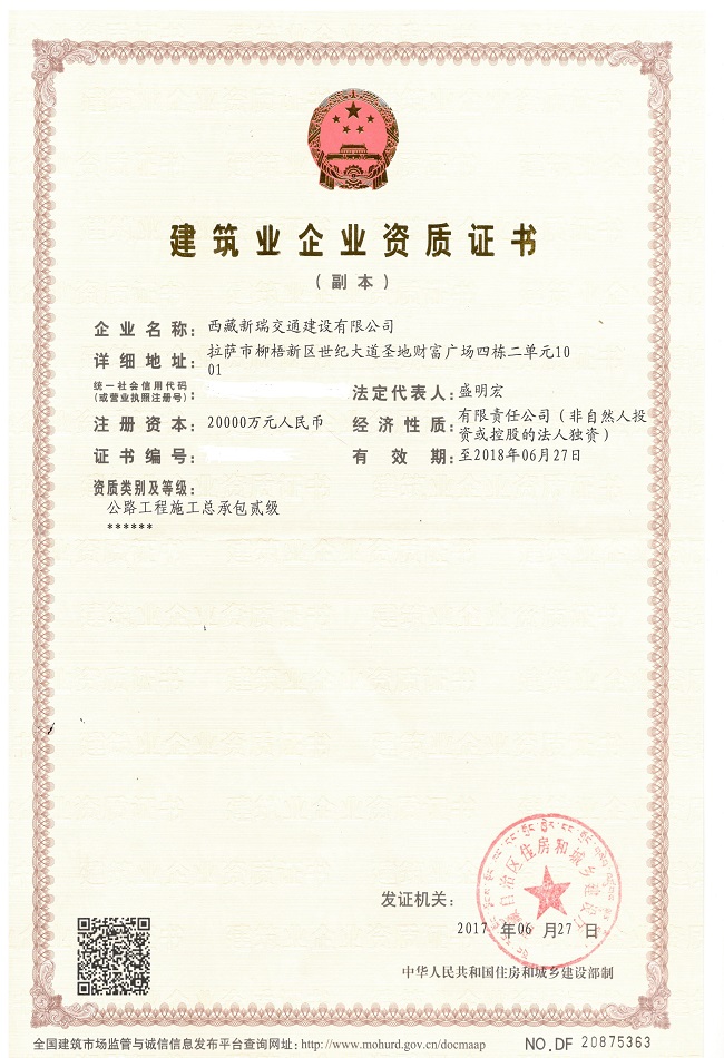 近日,路橋集團全資子公司西藏新瑞交通建設有限公司收到西藏自治區住建廳下發(fā)的資質(zhì)證書(shū),喜獲公路工程施工總承包貳級資質(zhì)。