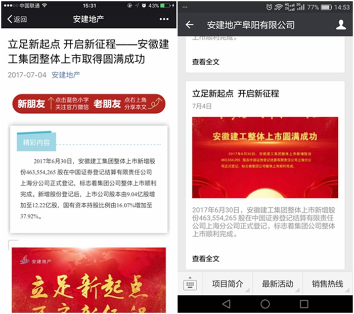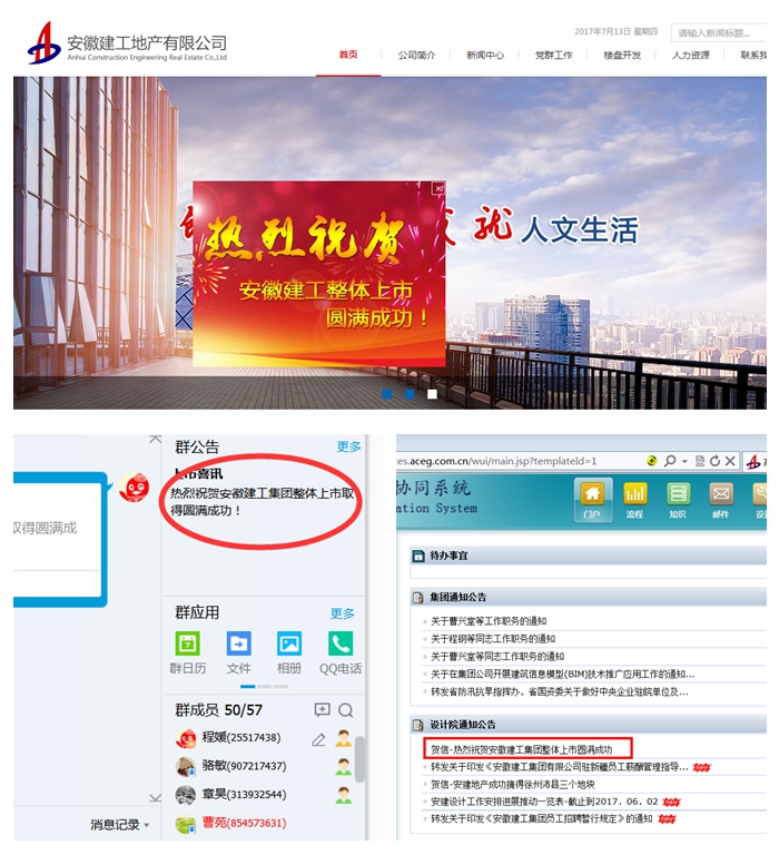 7月3日,安建地產(chǎn)公司網(wǎng)站在首頁(yè)顯眼處推送了集團整體上市的消息。7月4日通過(guò)公司CES公告向所屬各單位廣泛而精確的傳達了集團整體上市宣傳工作要求,并通過(guò)安建地產(chǎn)官方微信公共賬號向公司全體員工傳達了集團整體上市成功這一振奮人心的消息。