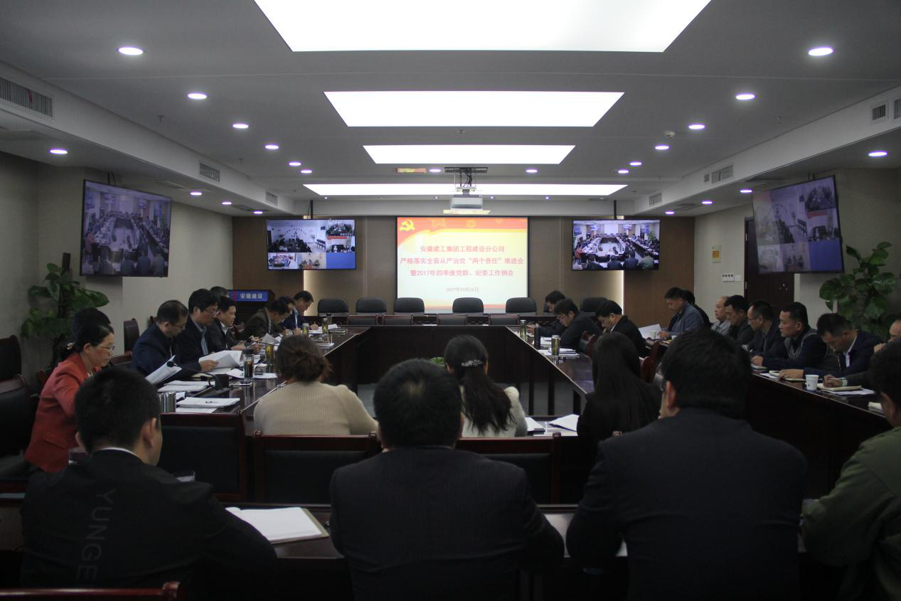 10月31日下午,安建建設公司召開(kāi)落實(shí)全面從嚴治黨“兩個(gè)責任”專(zhuān)題部署會(huì )暨2017年四季度黨群、紀委工作例會(huì )。公司領(lǐng)導班子成員、中層管理人員、群團組織負責人、所屬各辦事處、工管部、重點(diǎn)項目部班子成員、財務(wù)負責人,各基層黨群負責人及黨務(wù)工作者通過(guò)現場(chǎng)及分會(huì )場(chǎng)視頻參加會(huì )議。會(huì )議由公司黨委書(shū)記王可武主持。