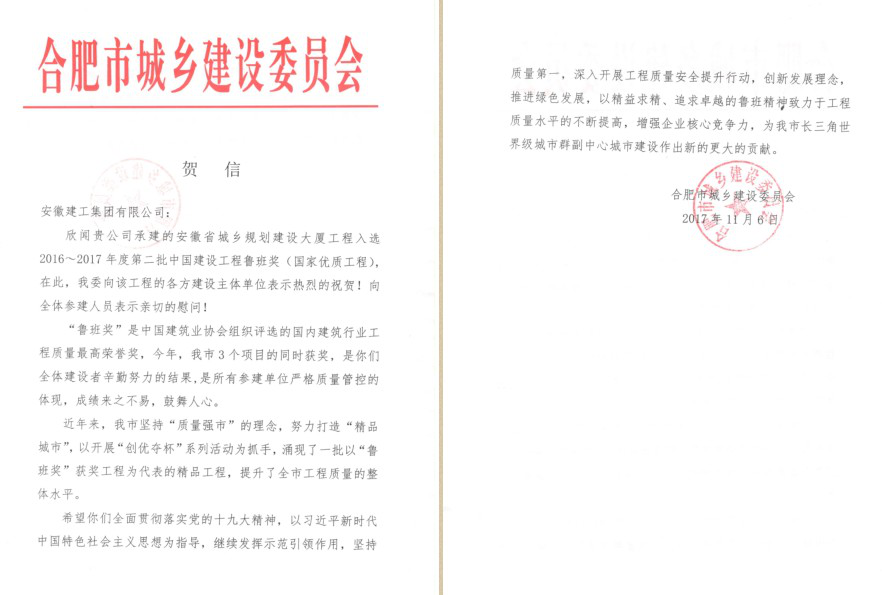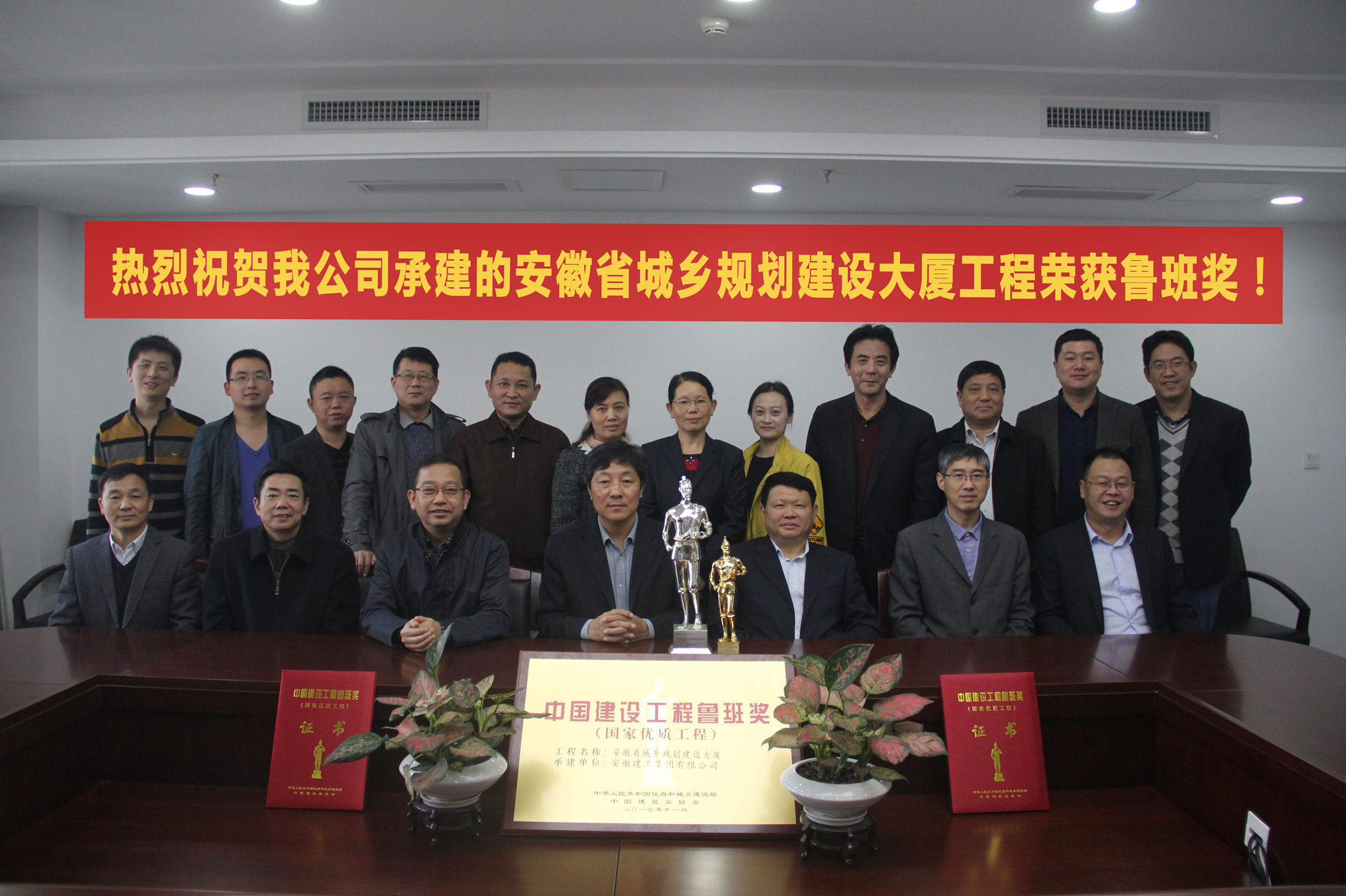 11月6日,中國建筑業(yè)在北京釣魚(yú)臺國賓館召開(kāi)會(huì )議,隆重發(fā)布“2016~2017年度中國建設工程魯班獎(國家優(yōu)質(zhì)工程)暨召開(kāi)紀念魯班獎創(chuàng )立30周年大會(huì )”。我公司承建的安徽省城鄉規劃建設大廈工程喜獲“魯班獎”,集團公司榮獲“創(chuàng )建魯班獎優(yōu)秀企業(yè)”,企業(yè)創(chuàng )優(yōu)工作實(shí)現了新的歷史突破!11月8日,合肥市城鄉建設委員會(huì )發(fā)來(lái)賀信,熱烈祝賀我公司承建的安徽省城鄉規劃建設大廈工程入選2016-2017年度中國建設工程魯班獎(國家優(yōu)質(zhì)工程)。