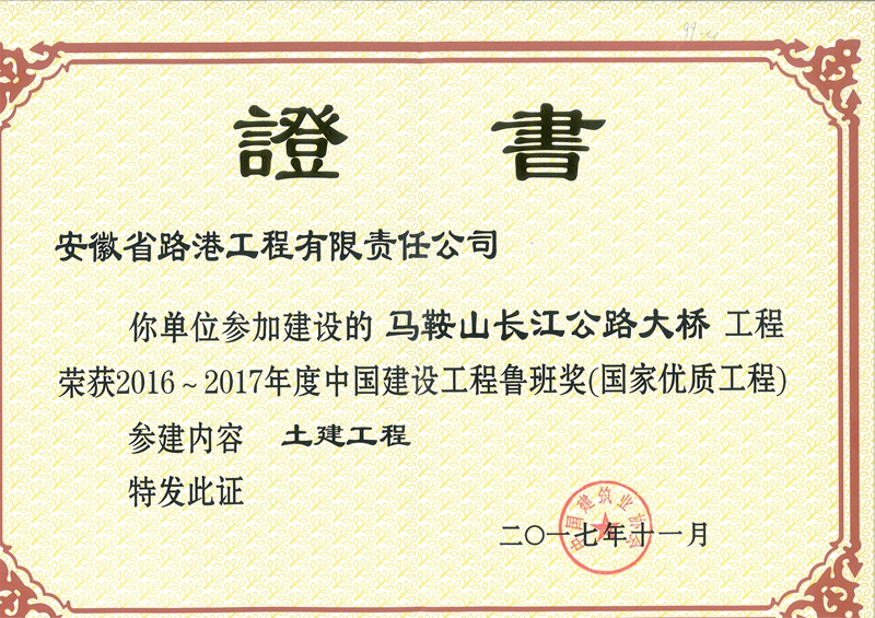 11月6日,從在北京釣魚(yú)臺國賓館召開(kāi)的紀念魯班獎創(chuàng )立30周年暨2016~2017年度創(chuàng )精品工程經(jīng)驗交流會(huì )上傳來(lái)喜訊,安徽路港參建的馬鞍山長(cháng)江公路大橋工程榮獲2016年-2017年度中國建設工程魯班獎(國家優(yōu)質(zhì)工程)。