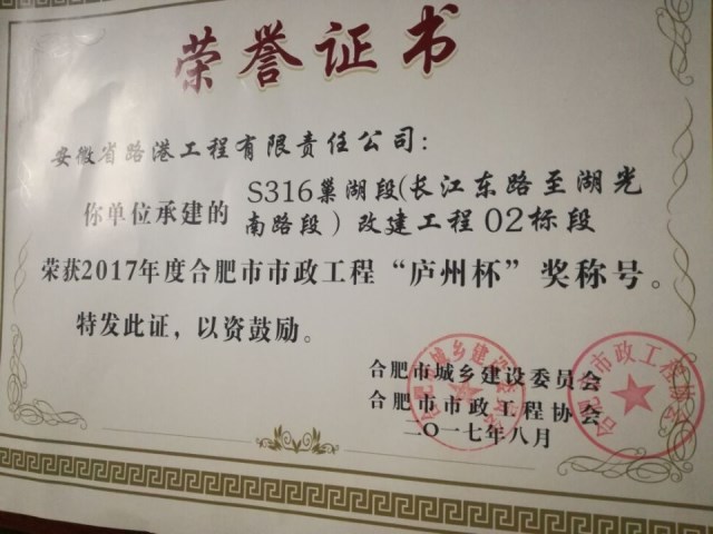 11月16日,從合肥市市政工程協(xié)會(huì )傳來(lái)喜訊,安徽路港承建的S316巢湖段(長(cháng)江東路至湖光南路)改建工程02標段喜獲2017年度合肥市市政工程“廬州杯”獎。