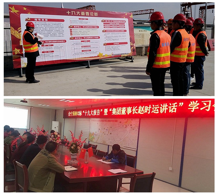 合寧預制標項目黨支部于近日組織召開(kāi)黨的十九大精神學(xué)習宣貫會(huì ),黨支部書(shū)記劉欽結合十九大召開(kāi)以來(lái)自身的學(xué)習體會(huì ),向與會(huì )人員宣貫了會(huì )議精神,要求全體員工要將會(huì )議精神深刻領(lǐng)會(huì ),并貫穿到項目管理及施工生產(chǎn)中。該項目黨支部專(zhuān)門(mén)制定了學(xué)習十九大精神的學(xué)習計劃,將《黨章》、《十九大報告單行本》、《十九大報告輔導讀本》等發(fā)放到黨員干部手中。在項目部駐地醒目位置專(zhuān)門(mén)設立了十九大精神宣傳展板,在宣傳欄張貼了十九大相關(guān)學(xué)習資料,多措并舉營(yíng)造學(xué)習氛圍。