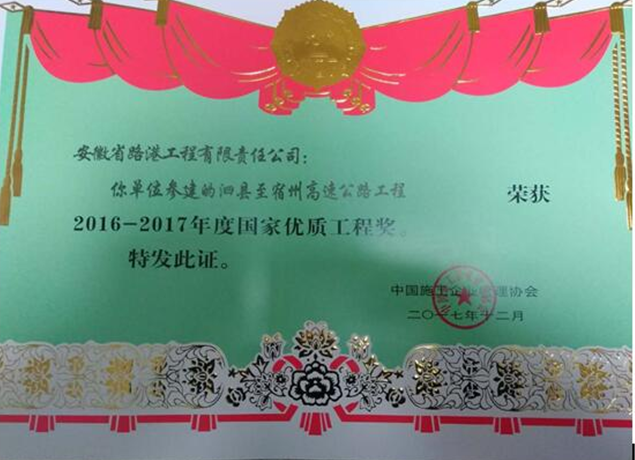 近日,安徽路港公司承建的泗宿高速10標在榮獲交通部?jì)?yōu)質(zhì)工程“李春獎”基礎上,再次榮獲2016-2017年度國家優(yōu)質(zhì)工程獎,這也是安徽路港首次獲得該獎項。同時(shí),徐士征同志被授予“國家優(yōu)質(zhì)工程突出貢獻者”榮譽(yù)稱(chēng)號。