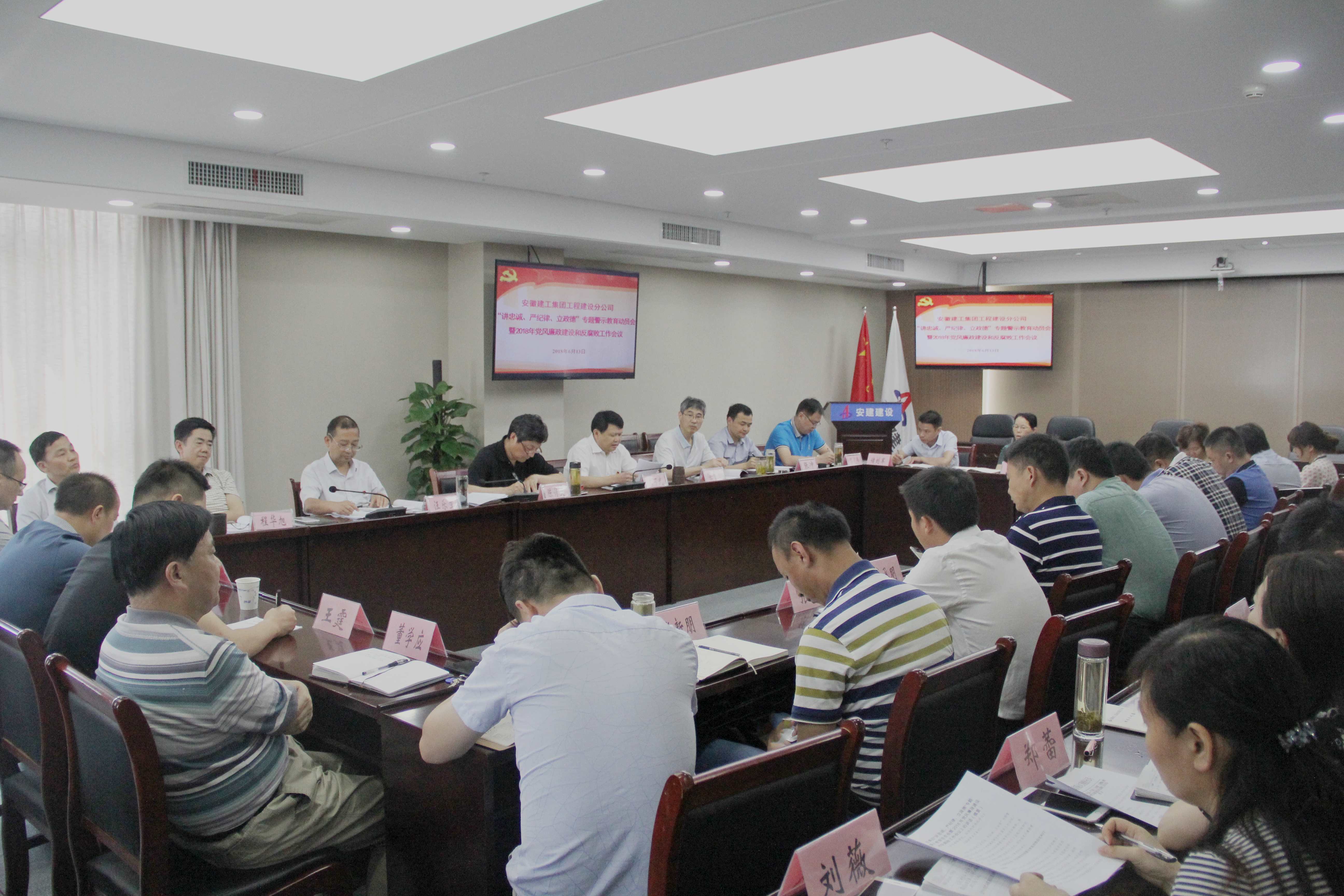 6月13日上午,安建建設公司“講忠誠、嚴紀律、立政德”專(zhuān)題警示教育動(dòng)員暨2018年黨風(fēng)廉政建設和反腐敗工作會(huì )議在安建大廈24樓會(huì )議室召開(kāi)。公司領(lǐng)導班子成員,全體中層管理人員、所屬各黨支部負責人、各辦事處、工管部、項目部負責人參加了會(huì )議,會(huì )議由公司黨委書(shū)記王可武主持。