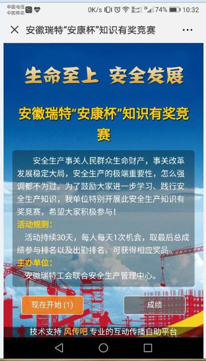 截止到6月18日,安徽瑞特工會(huì )聯(lián)合安全生產(chǎn)管理中心組織開(kāi)展了為期一個(gè)月的“安康杯”安全知識微信線(xiàn)上答題活動(dòng)。此次微信答題以及知識競賽活動(dòng)內容涵蓋安全生產(chǎn)有關(guān)法律法規、應急救援、職業(yè)安全健康管理、工傷預防等多個(gè)方面,在工會(huì )的大力宣傳下,廣大職工積極參與。