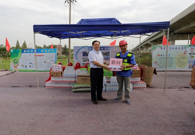 錢(qián)總一行來(lái)到項部施工現場(chǎng)看望和慰問(wèn)奮戰在施工一線(xiàn)干部職工,為廣大職工送去藥品、飲料等防暑降溫物品。錢(qián)總對安徽路橋集團廣大職工戰高溫、斗酷暑,堅持在一線(xiàn)施工的艱苦奮斗精神給予高度贊揚,對項目部現階段工作給予了肯定,要求項目部要進(jìn)一步加強管理,做好夏季施工防暑降溫工作,優(yōu)質(zhì)高效推進(jìn)工程建設。