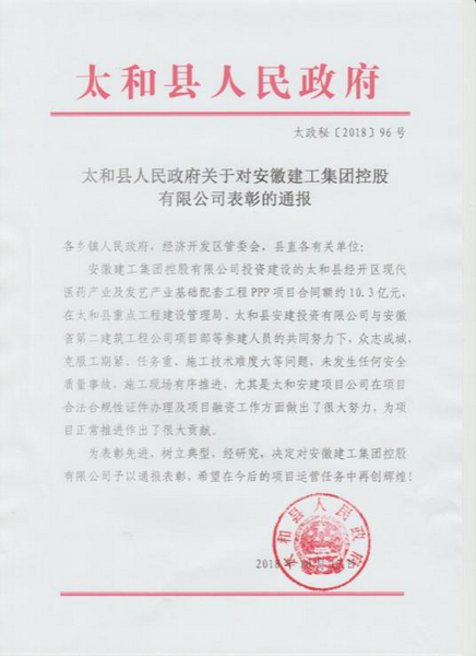 2018年10月17日,安徽建工集團控股有限公司投資建設的太和縣PPP項目喜獲太和縣人民政府全縣通報表彰!