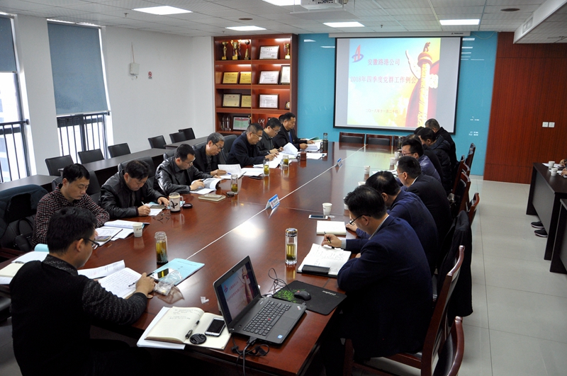 11月20日上午,安徽路港公司在安建大廈23樓會(huì )議室召開(kāi)2018年四季度黨群工作例會(huì ),公司領(lǐng)導班子,公司黨群部門(mén)、人力資源部、綜合辦公室負責人,分子公司、直管項目黨支部書(shū)記、副書(shū)記及黨群工作部門(mén)負責人參加會(huì )議。