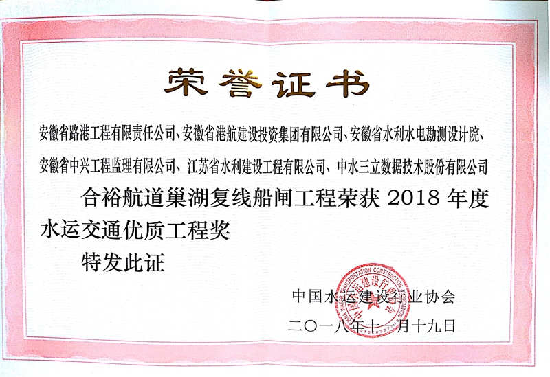 歲末年初,從中國水運建設行業(yè)協(xié)會(huì )傳來(lái)喜訊,安徽路港承建的合裕航道巢湖復線(xiàn)船閘工程榮獲“2018年度中國水運交通優(yōu)質(zhì)工程獎”,這也是公司繼2016年合肥港綜合碼頭工程榮獲該獎項后,船閘航道工程再次獲此殊榮。
