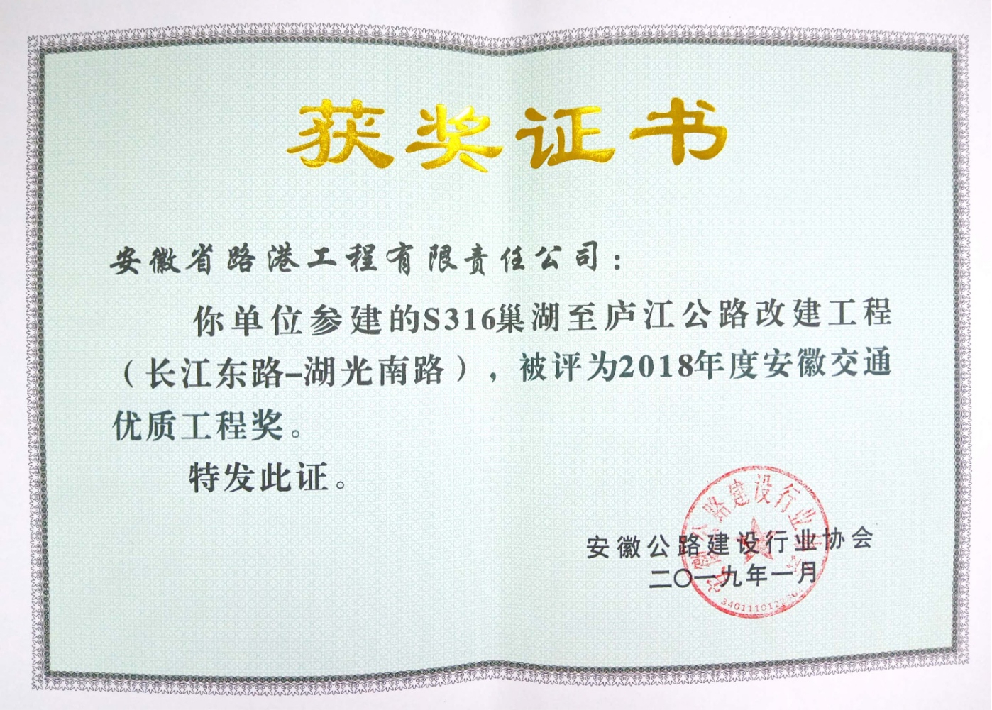 近日,從安徽公路建設行業(yè)協(xié)會(huì )傳來(lái)喜訊,安徽路港參建的S316巢湖至廬江公路改建工程榮獲2018年度安徽交通優(yōu)質(zhì)工程獎,全省共8個(gè)工程項目獲獎。