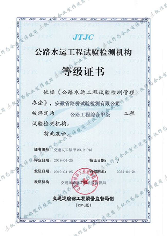 4月25日,經(jīng)國家交通運輸部工程質(zhì)量監督局審查核發(fā),我公司全資子公司安徽省路橋試驗檢測有限公司正式獲批公路工程綜合甲級資質(zhì),成為新資質(zhì)標準出臺后安徽省首家獲批公路綜合甲級檢測資質(zhì)的企業(yè)。