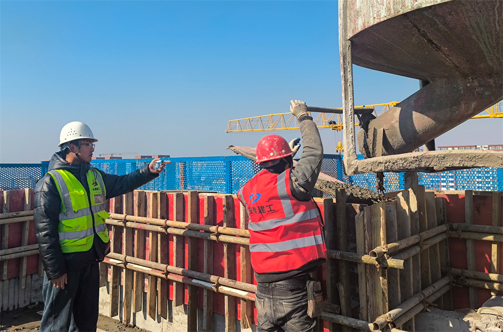 “即使寒風(fēng)刺骨,即使春節已至,但我愛(ài)崗的心熾熱無(wú)比,敬業(yè)的意志堅不可摧!”技術(shù)員劉振宇在旁站2號樓架構層混凝土澆筑工作。