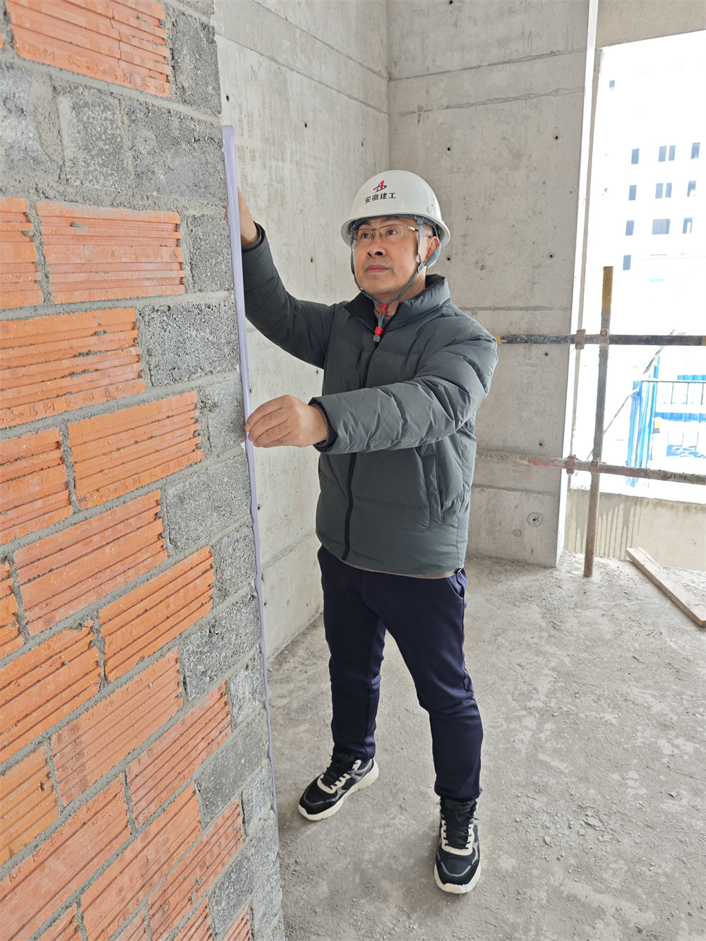 “項目全體職工加班加點(diǎn)奮斗在一線(xiàn),保進(jìn)度保質(zhì)量,就是為了給業(yè)主們一個(gè)滿(mǎn)意的答復?!奔夹g(shù)負責虞玉東正在檢查煤矸石砌體馬牙槎的尺寸及砌體磚縫厚度。