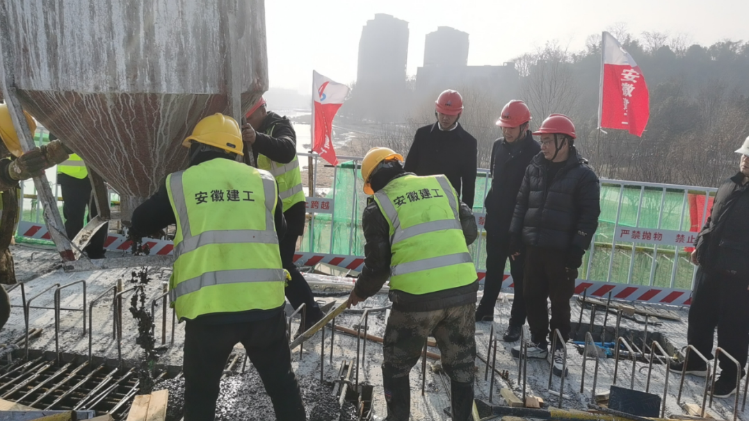 在桐城大建設龍眠新橋項目的施工現場(chǎng),吊車(chē)、挖掘機等施工機械來(lái)往作業(yè),項目部成員及施工人員堅守崗位,全力保障橋面施工。