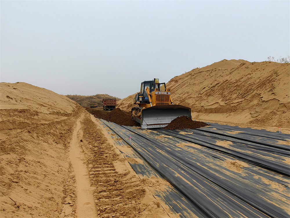 由于項目位于沙漠深處,項目團隊不僅要克服各項施工技術(shù)難題,更時(shí)刻要面臨無(wú)路、無(wú)水、無(wú)電、無(wú)信號、無(wú)生命痕跡的沙漠施工環(huán)境及變化莫測的惡劣天氣。為確保7月路基全線(xiàn)貫通,項目團隊展現出了極高的凝聚力和戰斗力,所有參建人員日夜與風(fēng)沙為伴,不畏艱辛,默默堅守,分秒必爭,夜以繼日,并根據當地實(shí)際白晝時(shí)長(cháng),實(shí)行倒班早六晚九的工作時(shí)長(cháng),全力以赴,奮戰在茫茫沙海深處。目前,各施工節點(diǎn)有序推進(jìn),已完成25公里的路基戈壁料回填及30公里的土工布鋪設。