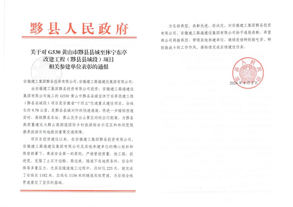 近日,建工投資所轄安徽建工集團黟縣投資有限公司受到黟縣人民政府通報表彰,充分肯定了項目公司在G530改建工程中所取得的突出成績(jì)。