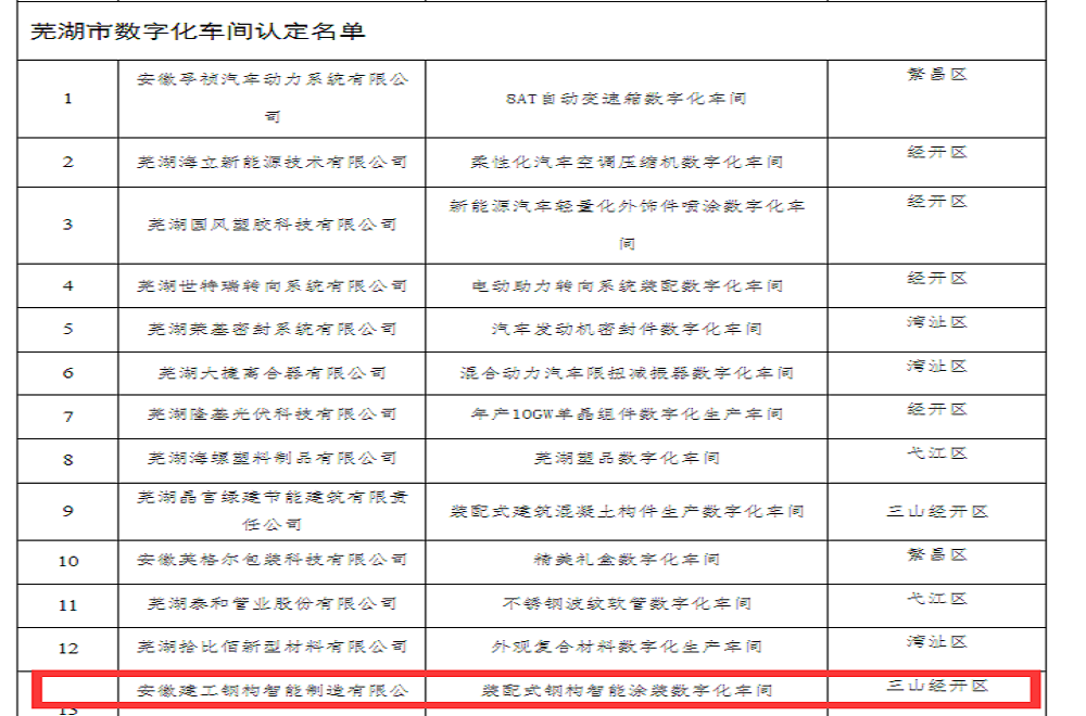 近日,蕪湖市經(jīng)濟和信息化局公布了2024年蕪湖市智能工廠(chǎng)和數字化車(chē)間認定名單,建工鋼構蕪湖公司榜上有名。