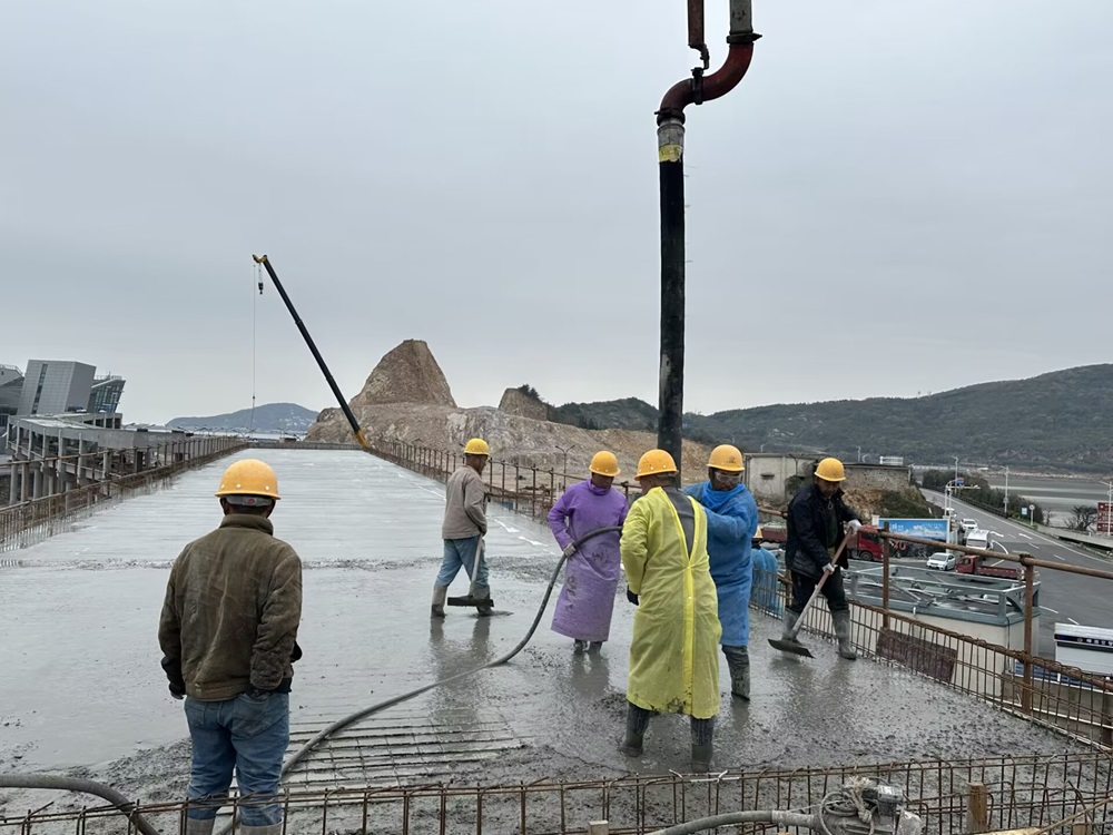 4月7日 ,在建工投資嵊泗項目公司和項目部統籌協(xié)調下,隨著(zhù)最后一車(chē)混凝土澆筑完成,嵊泗旅游交通集散中心登船連廊上部房建主體框架結構順利封頂,標志著(zhù)登船連廊整體正式進(jìn)入二次結構和安裝工程施工。