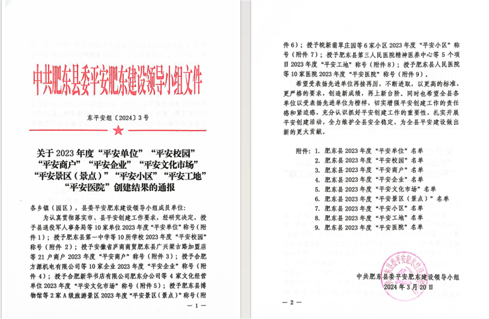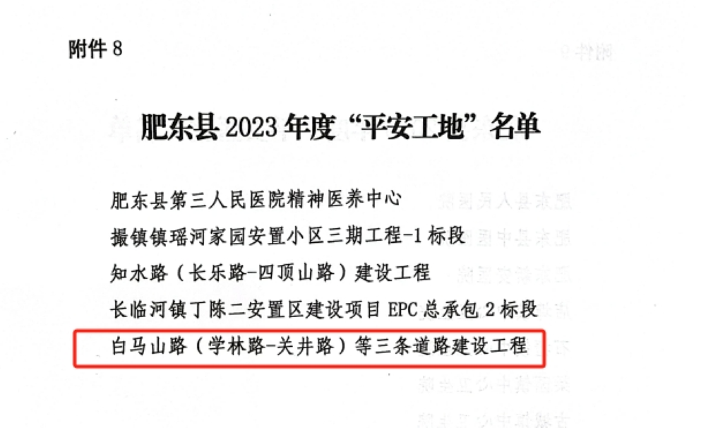 近日,建工建投集團承建的白馬山路(學(xué)林路-關(guān)井路)等三條道路建設工程項目榮獲肥東縣2023年度“平安工地”稱(chēng)號,項目安全管理得到屬地政府高度認可。