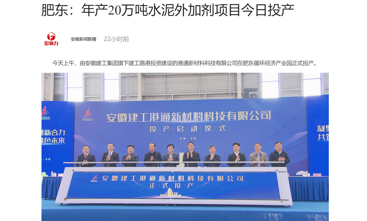 報道指出,安徽建工港通新材料科技有限公司水泥外加劑生產(chǎn)線(xiàn)的年產(chǎn)能為20萬(wàn)噸以上,主要產(chǎn)品為水泥速凝、緩凝、防水、防腐等多個(gè)系列,能夠在減少水泥使用量的同時(shí),有效提升建筑、建材、水泥制品強度,廣泛應用于道路、橋梁、住房等建筑施工以及廢棄建筑材料綜合利用等多個(gè)領(lǐng)域,是加快培育新質(zhì)生產(chǎn)力,打造綠色建筑產(chǎn)業(yè)的有益探索。
