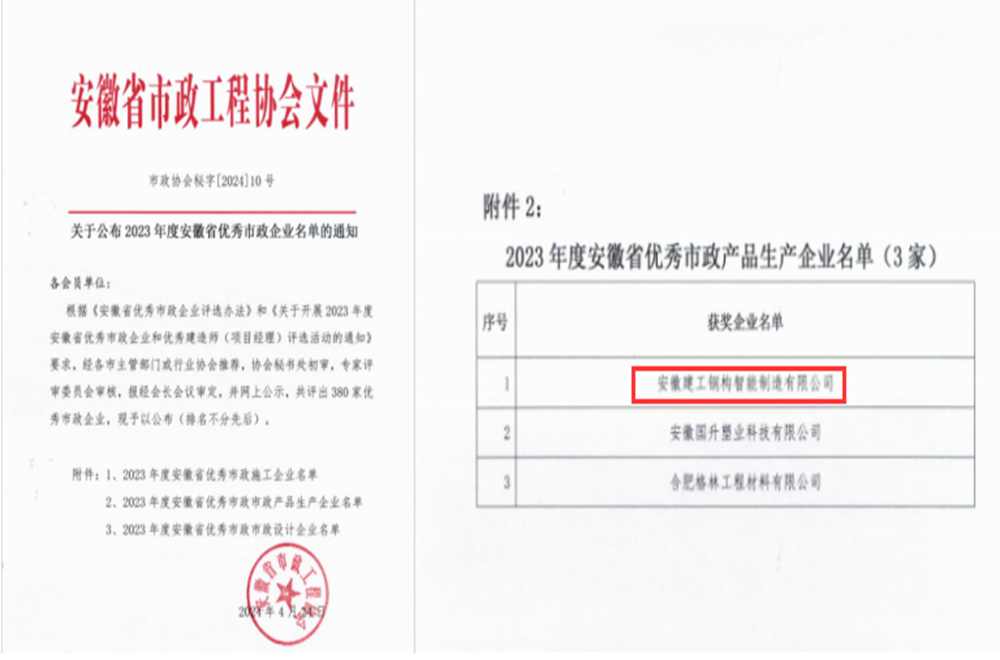 近日,2023年度安徽省優(yōu)秀市政企業(yè)和優(yōu)秀項目經(jīng)理(建造師)獲獎名單公示,安徽建工鋼構智能制造有限公司榮獲“2023年度安徽省優(yōu)秀市政產(chǎn)品生產(chǎn)企業(yè)”稱(chēng)號。