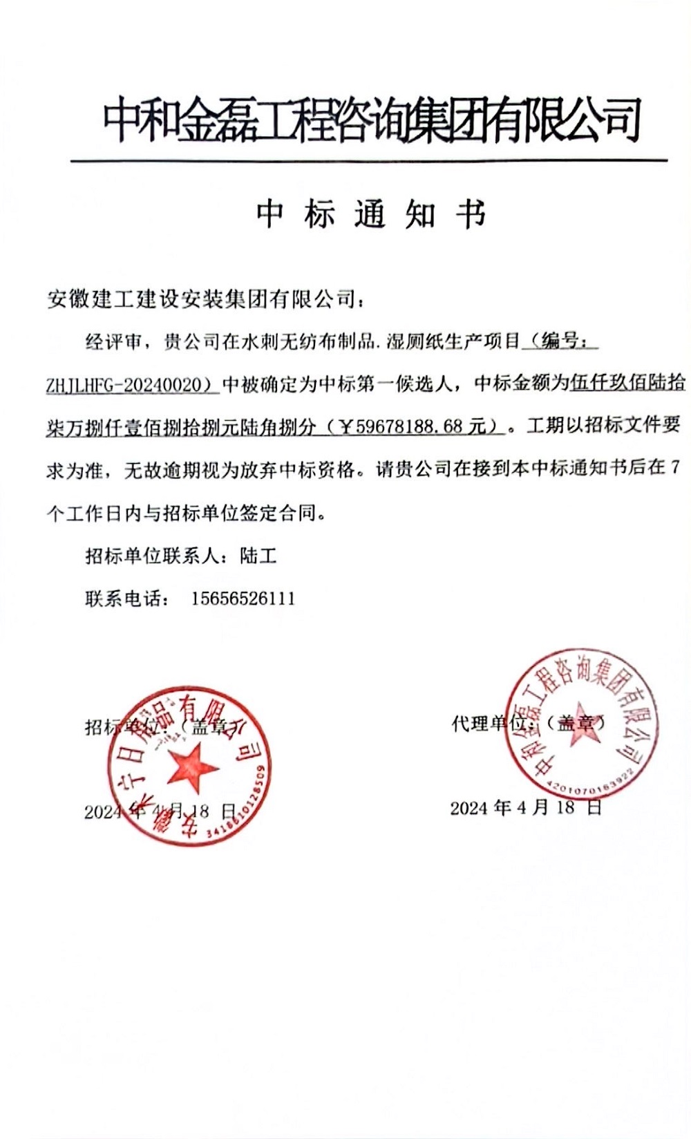 再傳喜訊!建工安裝中標安徽禾寧日用品有限公司水刺無(wú)紡布制品廠(chǎng)房建設項目,合計中標金額5968萬(wàn)元。