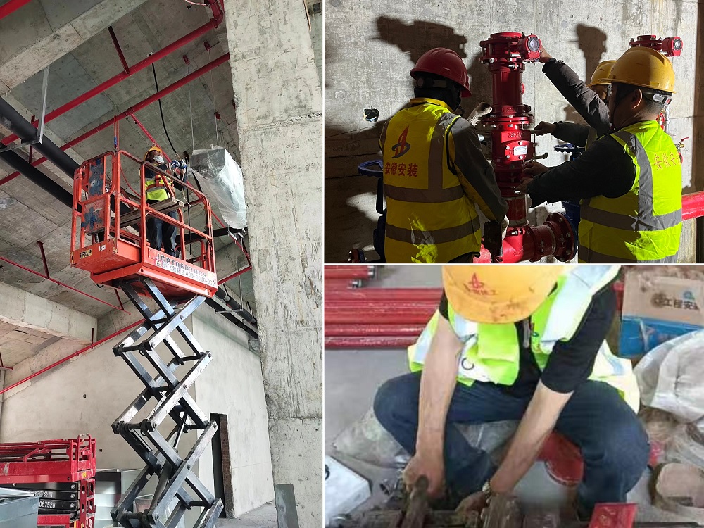 圖為電氣班組穿線(xiàn)、消防班組濕式報警閥安裝、消防班組管道預制