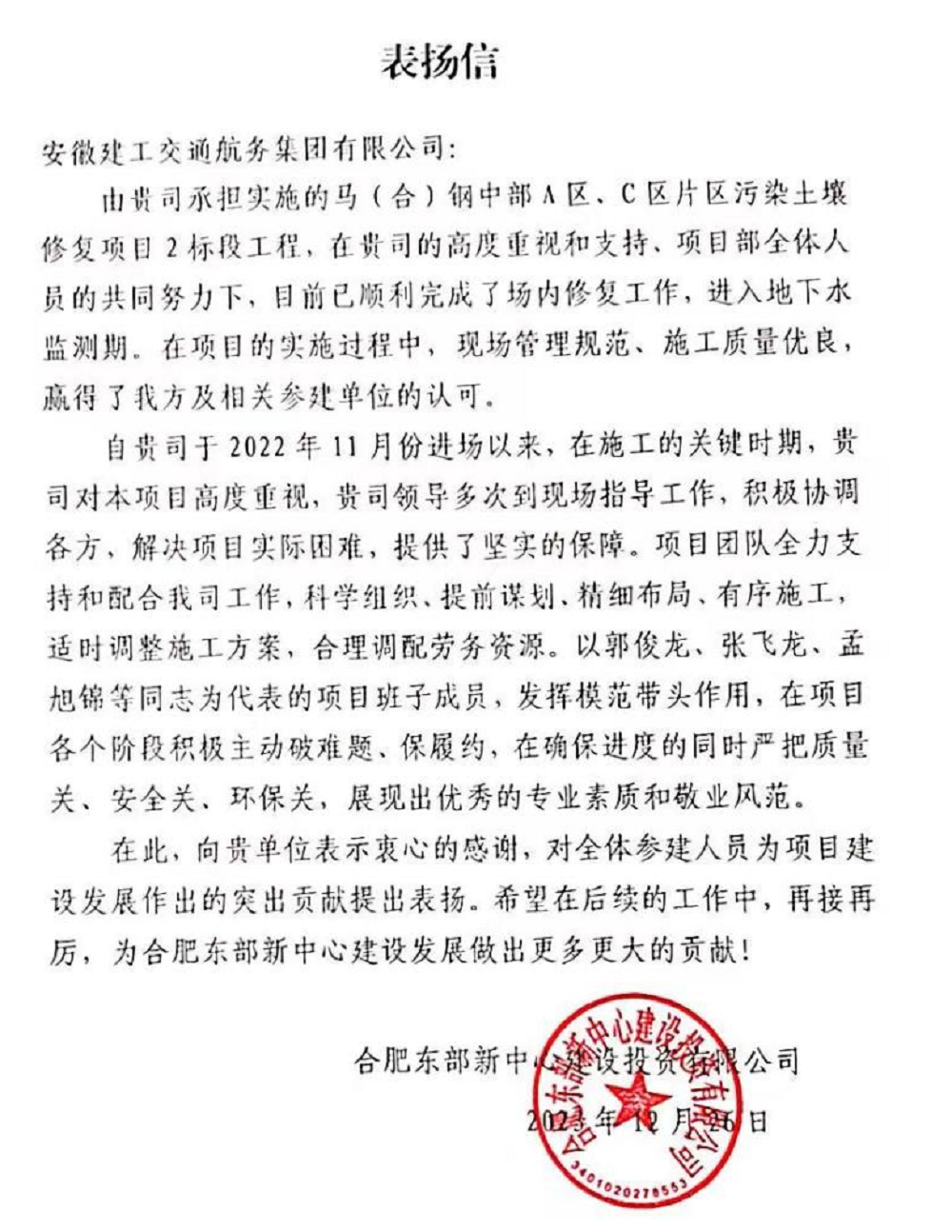 馬合鋼土壤修復項目作為當時(shí)全國第二大污染土壤修復類(lèi)項目,對公司在生態(tài)環(huán)保領(lǐng)域的發(fā)展具有重要意義,標志著(zhù)公司在生態(tài)環(huán)保業(yè)務(wù)方面邁出了堅實(shí)步伐。項目部破難題、保履約,提前謀劃、精心布局、有序施工,嚴把質(zhì)量關(guān)、安全關(guān)和環(huán)保關(guān),展現出優(yōu)秀的專(zhuān)業(yè)素養和敬業(yè)精神,榮獲業(yè)主單位合肥東部新中心建設投資有限公司表?yè)P。