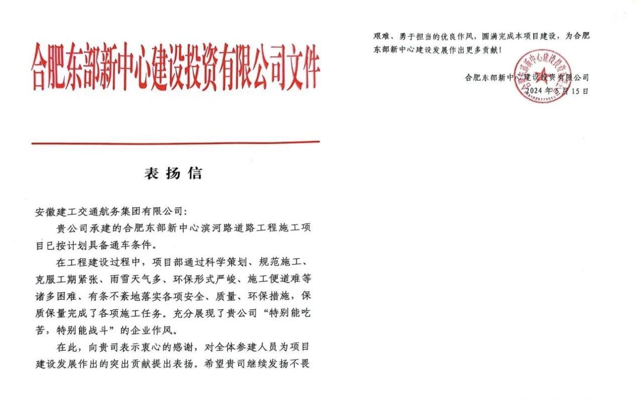 濱河路道路工程施工項目位于合肥市瑤海區東部新中心,2023年7月開(kāi)工,項目建成后,將進(jìn)一步緩解城區交通壓力。5月15日,合肥市東部新中心建設投資有限公司向公司發(fā)來(lái)表?yè)P信,對項目部攻克工期緊張、環(huán)保形勢嚴峻、施工便道不暢等諸多難題,保質(zhì)保量完成施工任務(wù)提出表?yè)P。