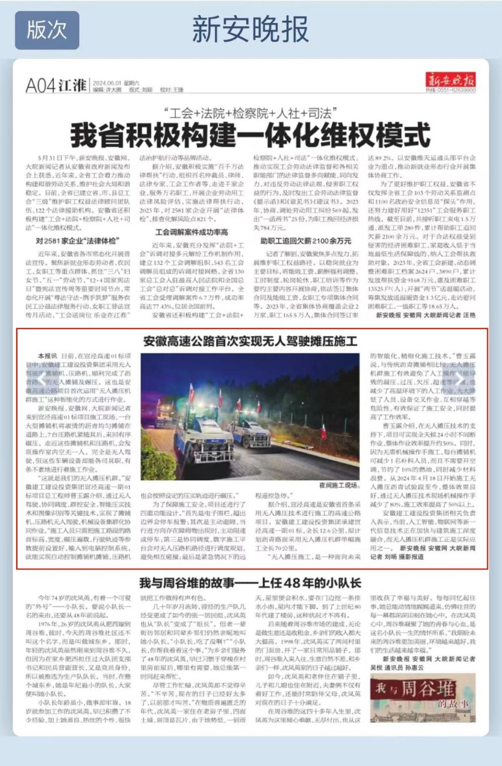 近日,新安晚報深入建工建投集團宣涇高速01標項目施工現場(chǎng),就該項目運用“無(wú)人攤壓機群施工”智能化方式作業(yè)進(jìn)行深入報道。
