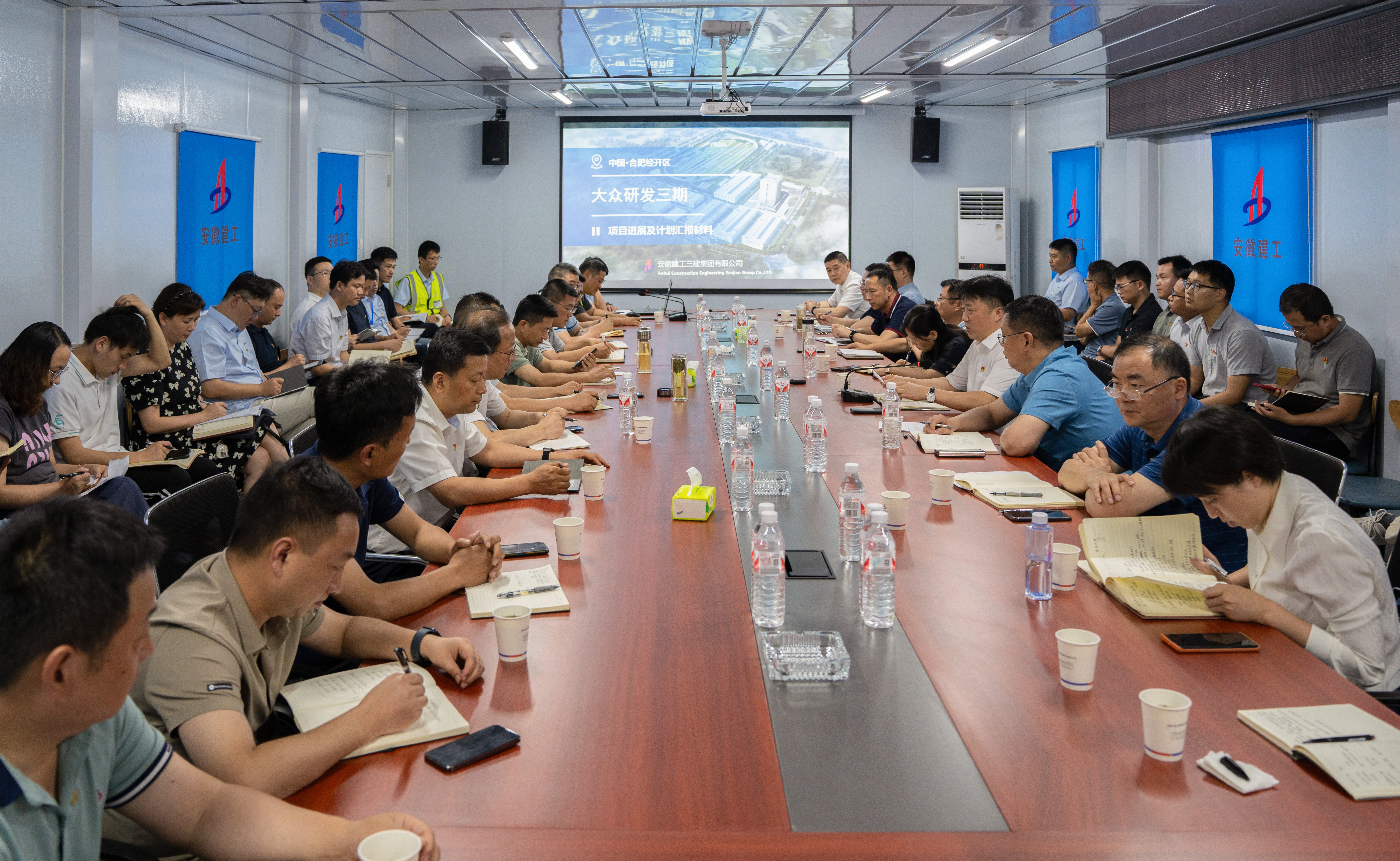 6月11日晚,安徽建工三建集團在臨湖智能制造產(chǎn)業(yè)園項目現場(chǎng)召開(kāi)大眾科技三期暨臨湖智能制造產(chǎn)業(yè)園項目現場(chǎng)調度會(huì ),就高質(zhì)量、高效率推進(jìn)兩項目建設進(jìn)行再動(dòng)員、再布置、再發(fā)力。建工三建黨委書(shū)記、董事長(cháng)何洪春主持會(huì )議并講話(huà),黨委副書(shū)記、總經(jīng)理谷建偉作工作部署,公司領(lǐng)導班子成員出席會(huì )議并作工作要求。