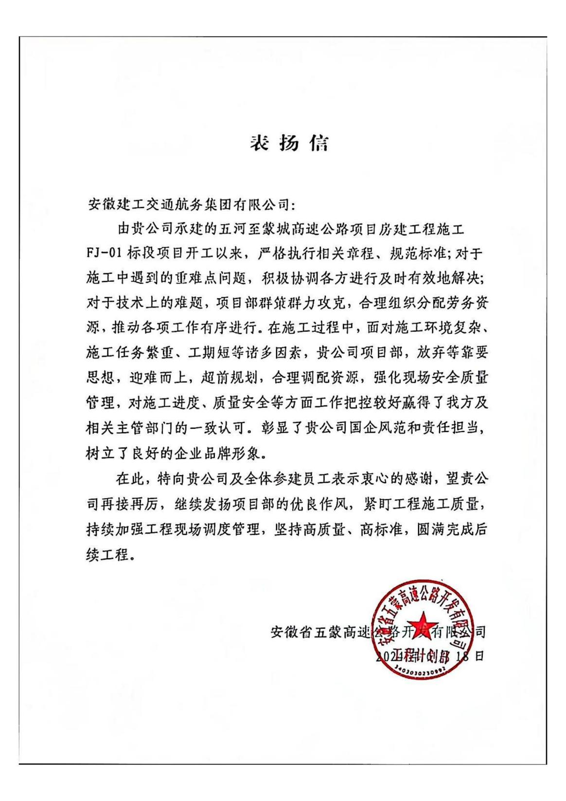 日前,公司承建的五河至蒙城高速公路項目收到業(yè)主安徽省五蒙高速公路開(kāi)發(fā)有限公司表?yè)P信,對五河至蒙城高速公路項目房建工程施工FJ-01標項目部全體參建人員為推進(jìn)項目建設作出的突出貢獻表示衷心感謝。
