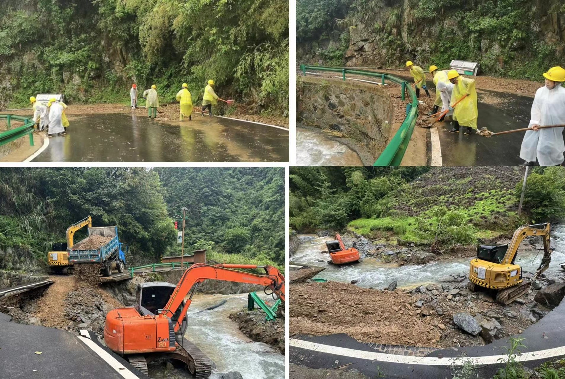 皖南分公司共組織搶險救援人員20人,臨時(shí)調配三臺挖機、兩輛皮卡、20把鐵鍬和一臺15千瓦的發(fā)電機。經(jīng)過(guò)與呈陽(yáng)村相關(guān)負責人溝通后,確定現場(chǎng)應急搶險工作分為兩部分,一是河邊鄉道山體滑坡的碎石清理;二是河堤道路坍塌的搶修。分公司應急搶險救援人員迅速進(jìn)行分工,在施工路段設置警示標識,將人員與機械調配到位,對塌方路段進(jìn)行清理。