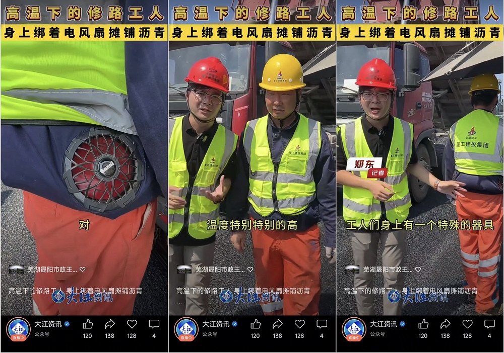 蕪湖主流媒體《大江資訊》記者深入現場(chǎng),發(fā)現面對高溫環(huán)境,建工建投集團G236長(cháng)江南路(一期)項目部為工人們準備了降溫神器——“空調服”。