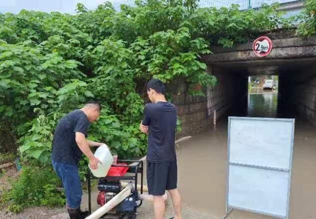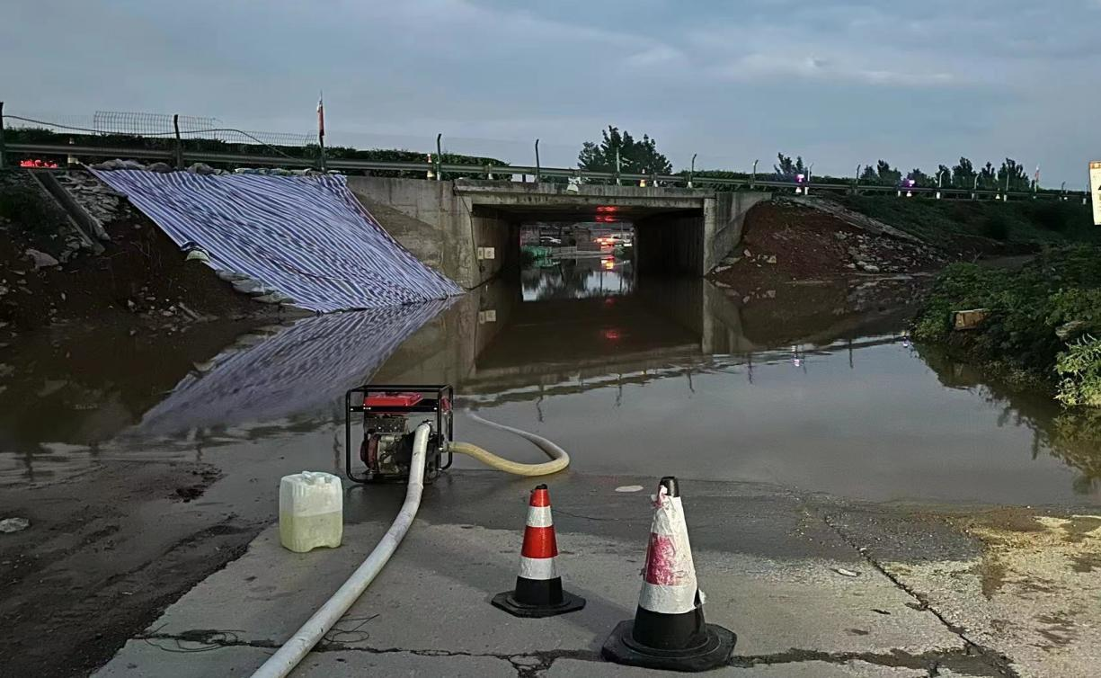 連霍高速下穿路段由于地勢較低,積水嚴重,已對過(guò)往車(chē)輛通行造成嚴重影響。面對這一緊急情況,項目部迅速響應,對遇險路段進(jìn)行封堵,組織人員安裝水泵,鋪設水管,爭分奪秒進(jìn)行排水工作,并安排專(zhuān)人進(jìn)行24小時(shí)值班,項目班子成員帶頭沖鋒,充分發(fā)揮“兩個(gè)模范”作用,為當地村民的安全出行保駕護航。