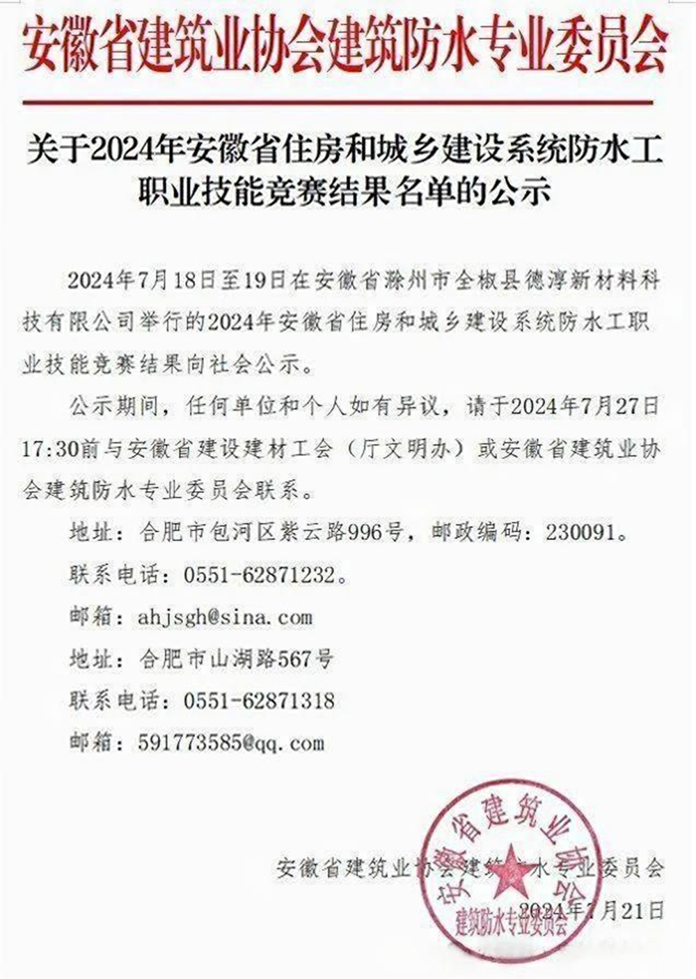 本次比賽由安徽省住房和城鄉建設廳、安徽省總工會(huì )、安徽省人力資源和社會(huì )保障廳聯(lián)合主辦,安徽省建設工程質(zhì)量安全監督總站、安徽省建筑業(yè)協(xié)會(huì )建筑防水專(zhuān)業(yè)委員會(huì )、滁州市住房和城鄉建設局等單位協(xié)辦,全省共有60支代表隊參加比賽。本次大賽分為高分子(PVC)卷材和SBS改性瀝青兩個(gè)項目,內容包括理論知識測試和實(shí)操考試。比賽現場(chǎng),憑借嫻熟的技能手法、精密的細節處理,黃吉發(fā)得到裁判的一致認可,并斬獲了個(gè)人一等獎,同時(shí)建工建投集團也被授予團體一等獎。